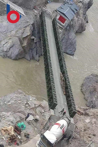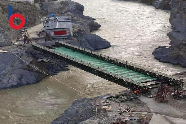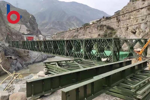 江蘇貝雷鋼橋有限公司派專門的技術(shù)人員前往甘肅省甘南藏族自治州迭部縣,架設(shè)橋型四排單層加強(qiáng)型(QSR)鋼橋,貝雷鋼橋架設(shè)的鋼橋使用200型產(chǎn)品,全橋長(zhǎng)45.72米,屬于單跨橋,整個(gè)橋面凈寬 4.2米,荷載55噸。